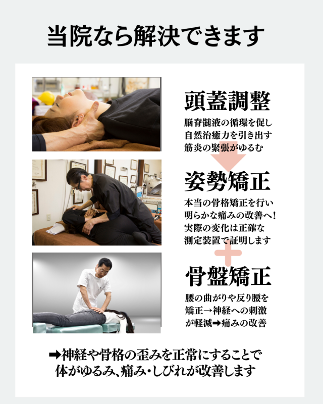 痛む箇所に原因があるのではなく、全体のバランスを整え、脳脊髄液の流れを良くしていくことで改善します。そして何よりも<良くなって○○をしたい!>というご本人の前向きな気持ちが良い結果をもたらします。