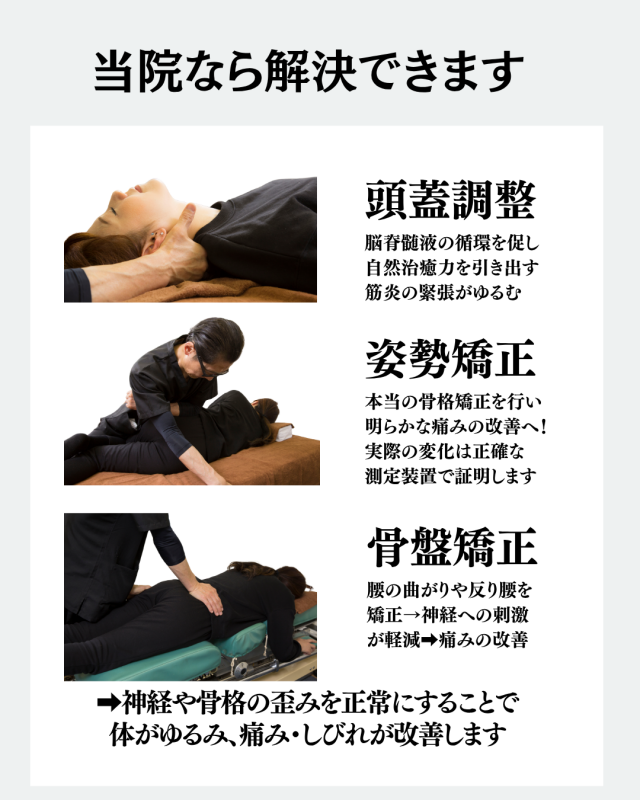 当院はとてもソフトなクラニアル、カイロプラクティックにより体の歪みを修正します。
