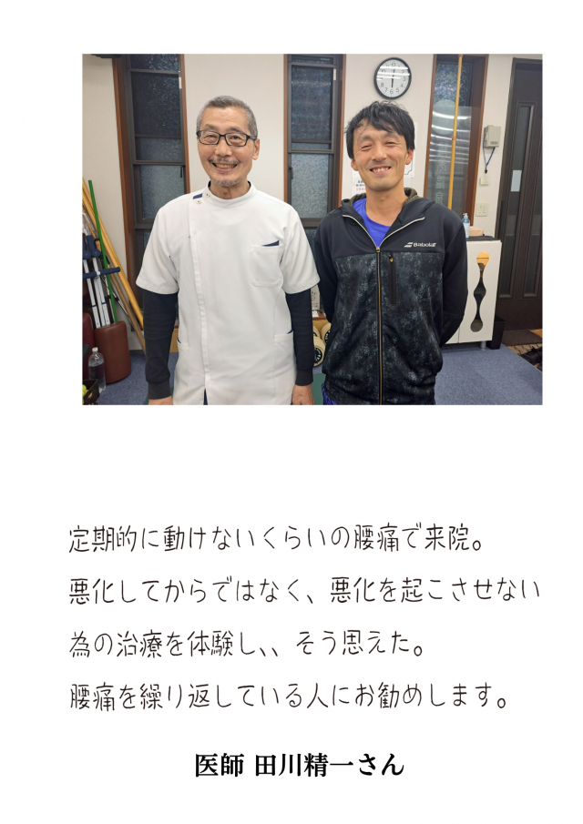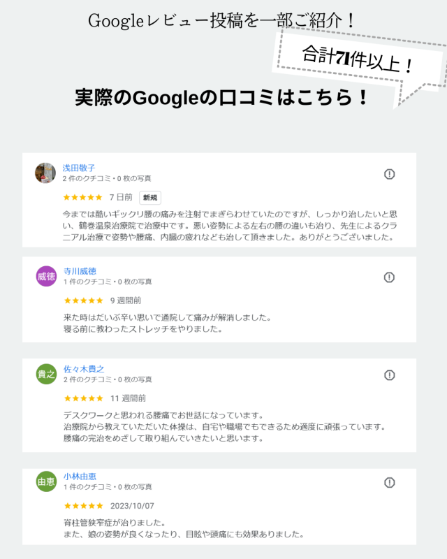初めから伝えてくれる整体院は少ないので重症の方に合わせお伝えします。不定期来院やひと月判断は難しく、本当の効果は2ヶ月目以降にかかっています。施術計画を立てしっかり通院し、効果維持の運動療法を自宅で行う事で良い姿勢が定着し、痛みが引いていきます。痛みと違う箇所への施術に不思議な思いで通っていたら、楽になっていた!という方が殆どです。
